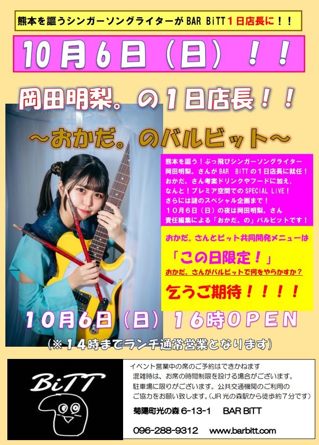 - 10月6日→【熊本】熊本】光の森、barBITT1日店長