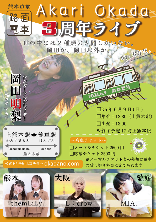 - 6月9日→【熊本】岡田明梨。3周年ライブIN熊本市電